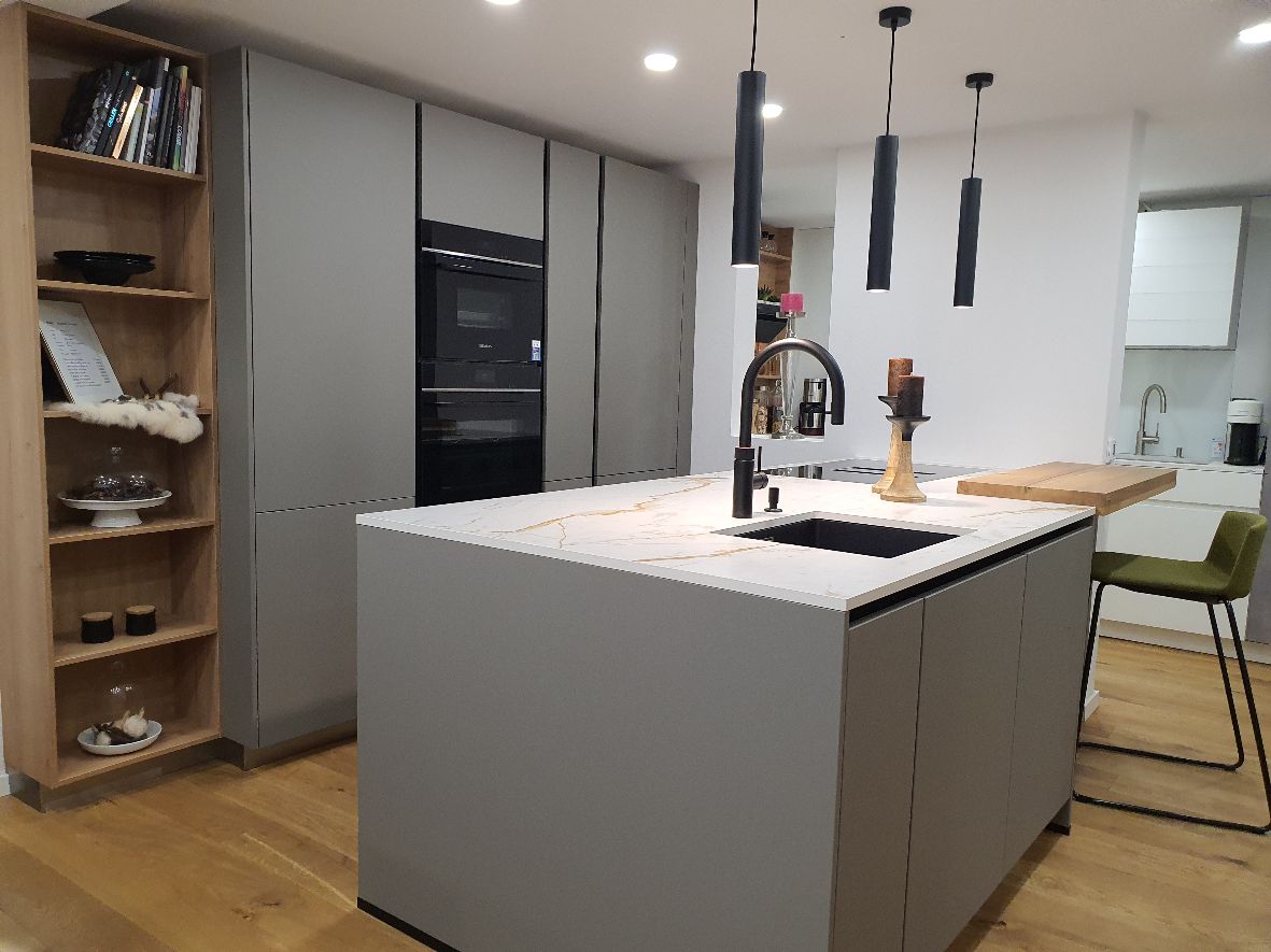 •••• Ausstellungsküche in Easytouch Taupegrau mit schwarzer Griffmulde und Dekton-Arbeitsplatte. ••••